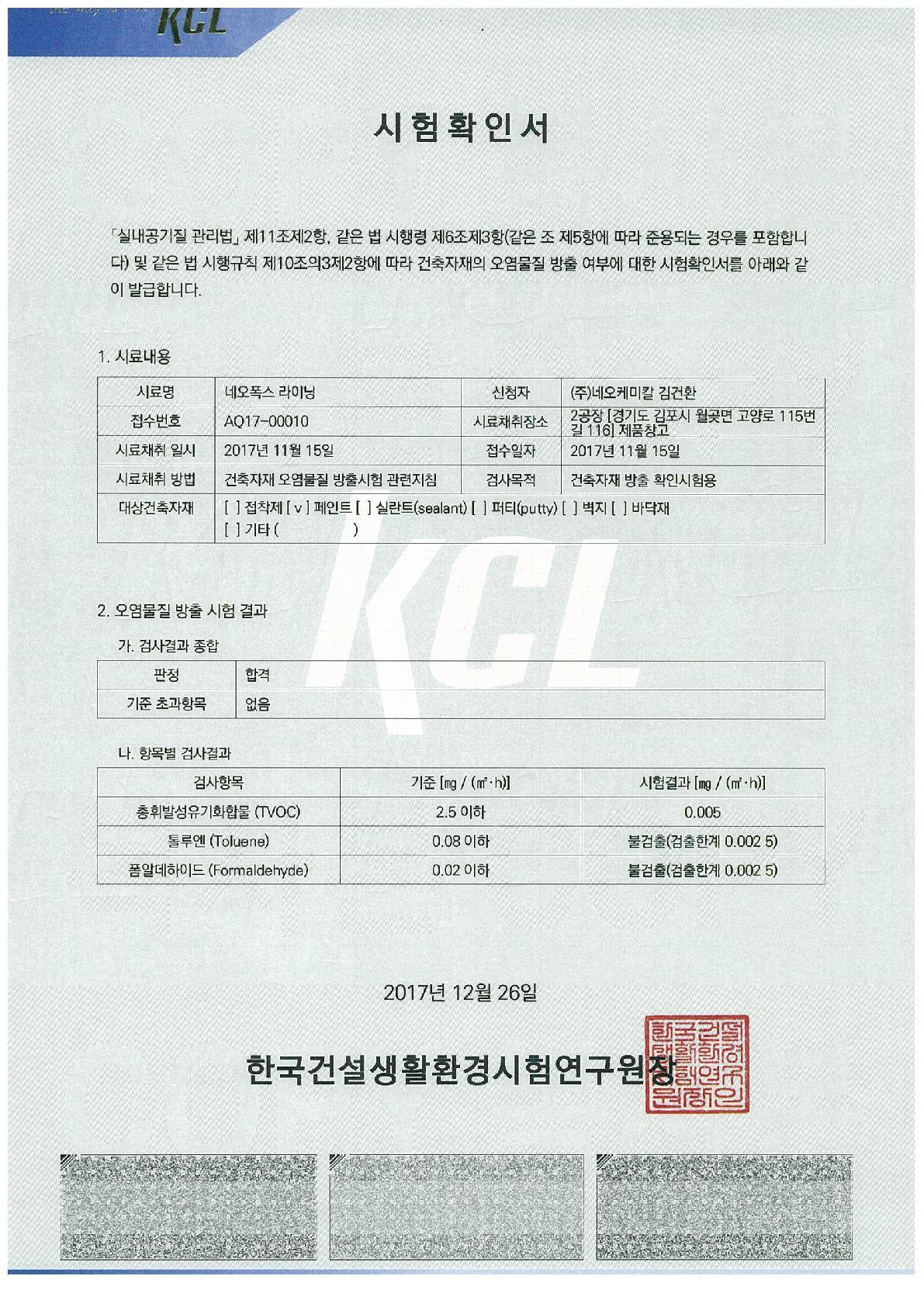 네오폭스 하도_건축자재의 오염물질 방출 시험확인서