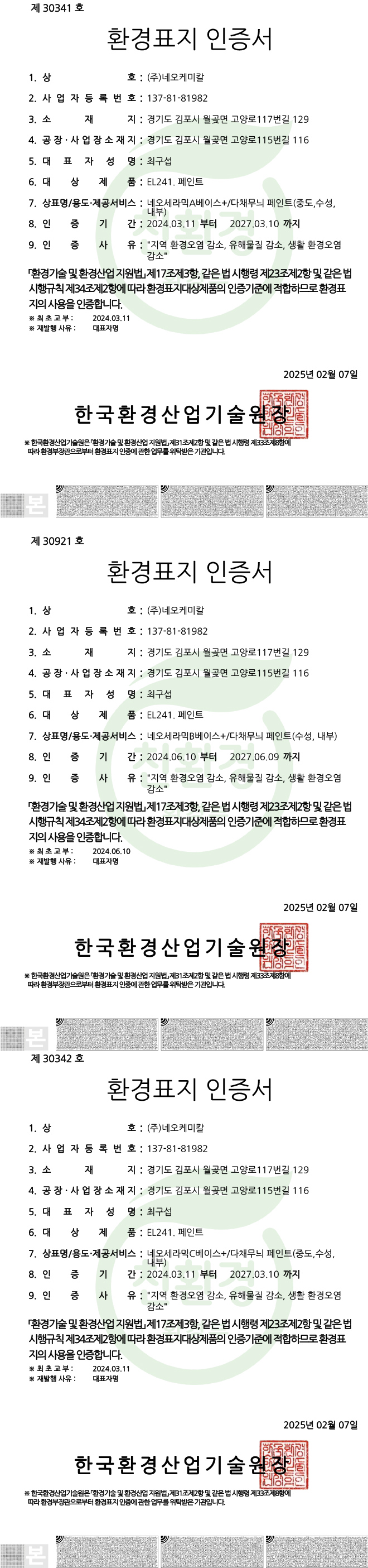 > 친환경인증제품 > 친환경세라믹탄성코트 인증서