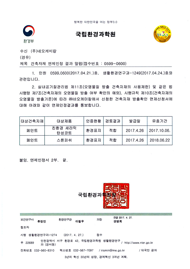 건축자재 면제인정결과알림공문서(친환경네오탄성코트,네오아띠)