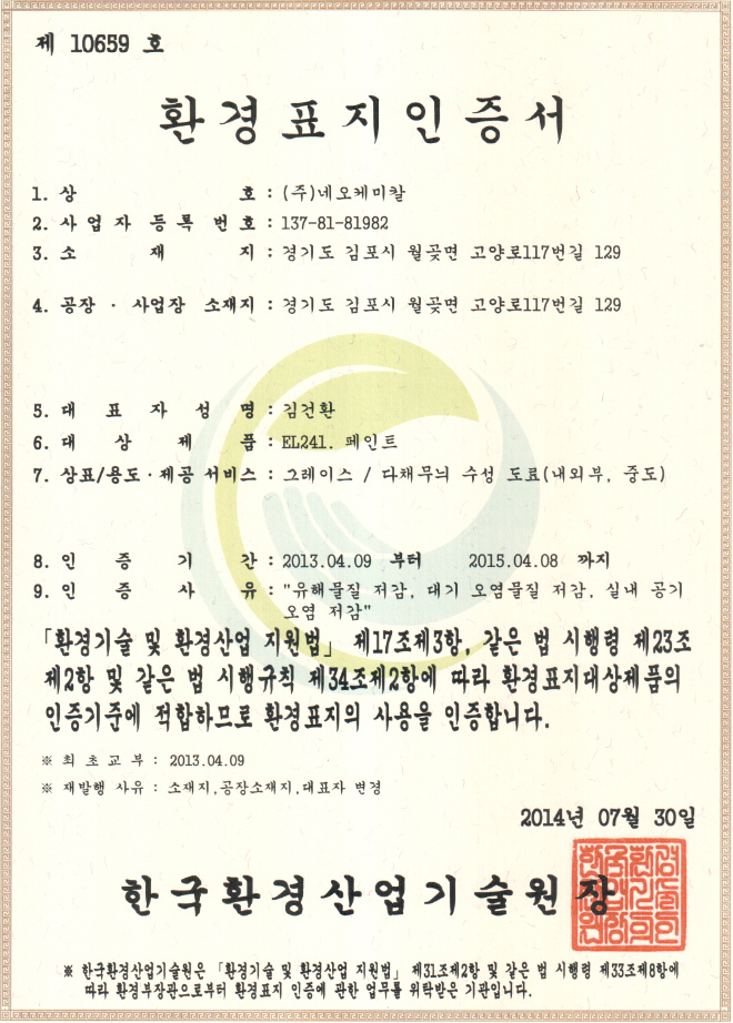 환경표지인증서 인증 (제품명 : 친환경세라믹탄성코트)